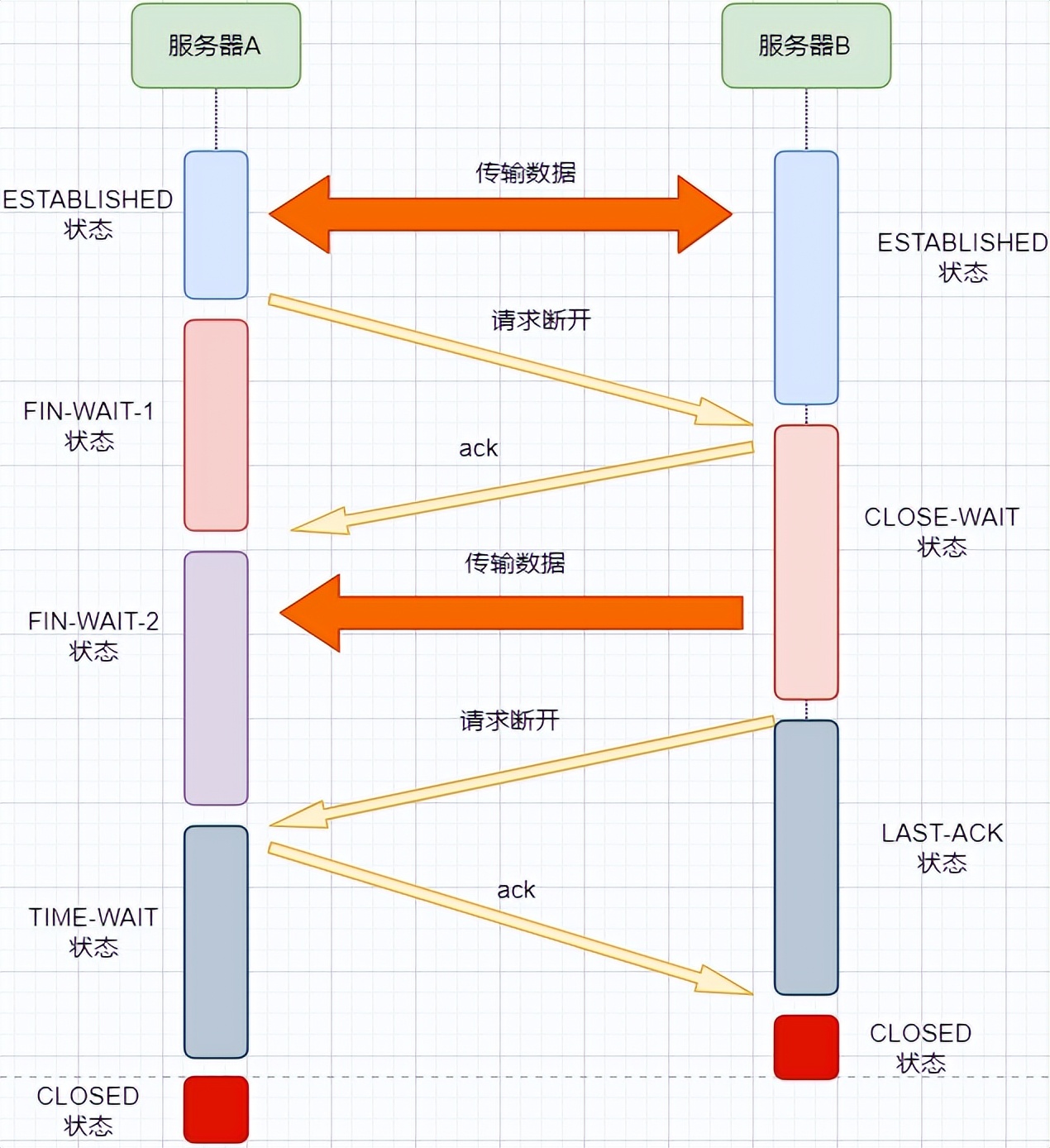 5.最后,机器A等待存储两个消息的最长时间,机器B在收到ACK消息后关闭连接并进入 CLASED状态