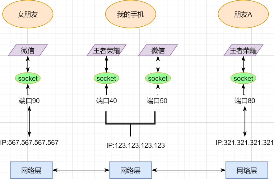 一个主机有多个进程,过程之间存在不同的网络通信,就像对黑人的 side 和朋友和女朋友聊天的 Weibo.我的手机与两个不同的机器同时通信.所以当我在手机上获取数据时,如何区分是WeChat的数据,还是王者的数据?然后,您必须在网络层的顶部添加另一个层: