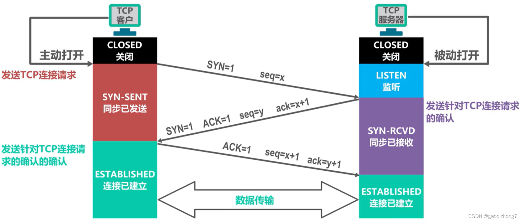 - 第三次握手: 1 个客户端发送 TCP 连接请求的确认 (ACK=1, seq=x+1, ack=y+1); 2 个客户端,服务器访问: 连接建立;