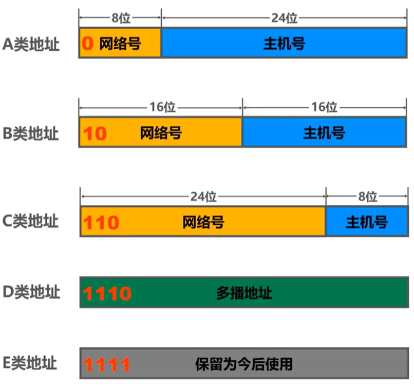 根据32位IP地址的前段值,IP地址可以分为五个类别:A、B、C、D和E: