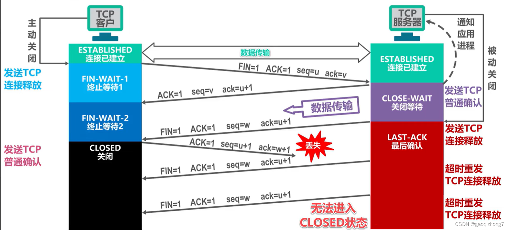 - 在第三个损失时,服务器没有收到确认,因此超时再传输。 如果重复传输没有得到响应,关闭此连接。