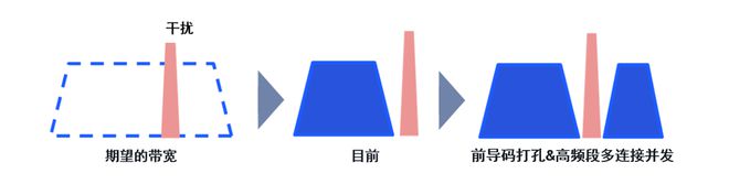 最后是自适应连接。在某些情境下,现有用户将在空的连续频道(如20 MHz或40 MHz)中使用带宽的一部分,在这种情况下,它通常阻止AP访问点使用频谱。对此,WI-FI7提供了一种名为“预导孔打”的创新解决方案,在没有上述干扰的情况下支持AP接口,允许使用这个连续通道(如下图所示)。虽然孔的数量降低了总带宽,但它还是比其他方法更广泛的渠道。
