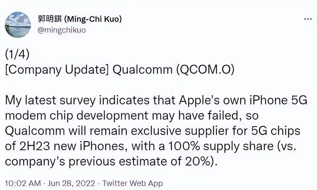 6月29日,话题 苹果5G芯片故障 分析师郭明(GuoMing)表示:“最新的调查显示,苹果的5G模块化解码器芯片开发已经失败,高盛仍将是2023年iPhone模块化解码器芯片的唯一供应商。