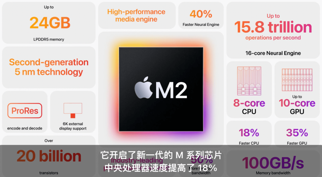 就在6月初, 苹果宣布新的M2芯片 ,采用了第二代5nm技术.有200亿的晶体管,这个芯片已经应用于MacBook Pro的新版本,测评数据显示,与最新10个核心PC笔记本电脑芯片相比,M2的中央处理器功率消耗水平相同,所取得的业绩几乎是前一次的两倍。此外,当M2芯片达到上述的PC笔记本电脑芯片性能峰值时,功耗只有1/4。与最新12个核心PC笔记本电脑芯片相比,M2芯片只需要 1/4 的前面的芯片才能达到 90% 的最高性能。