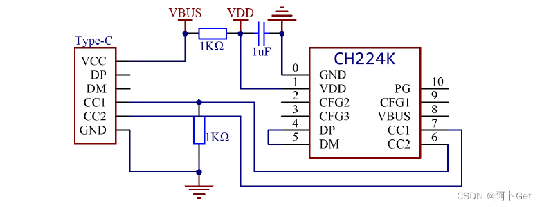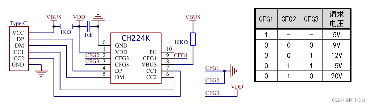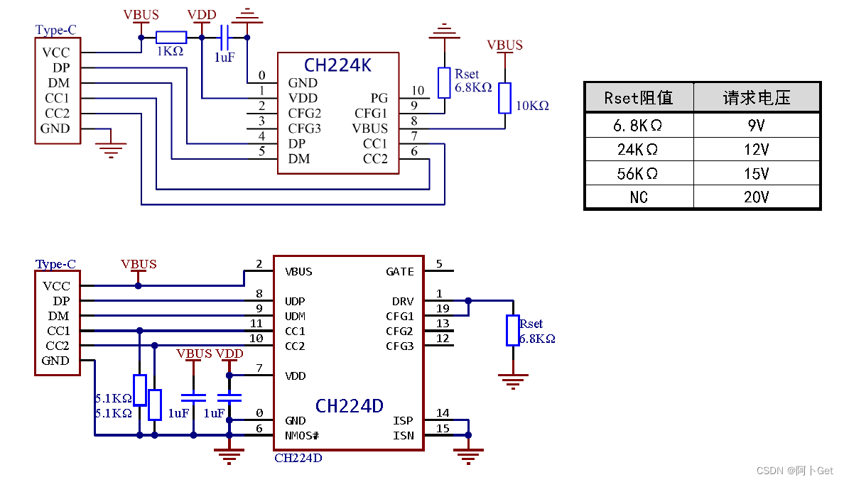 方法1:CH224K/CH224D使用C型母端口,单个电阻配置为9/12/15/20V(见图中电阻配置6)。
