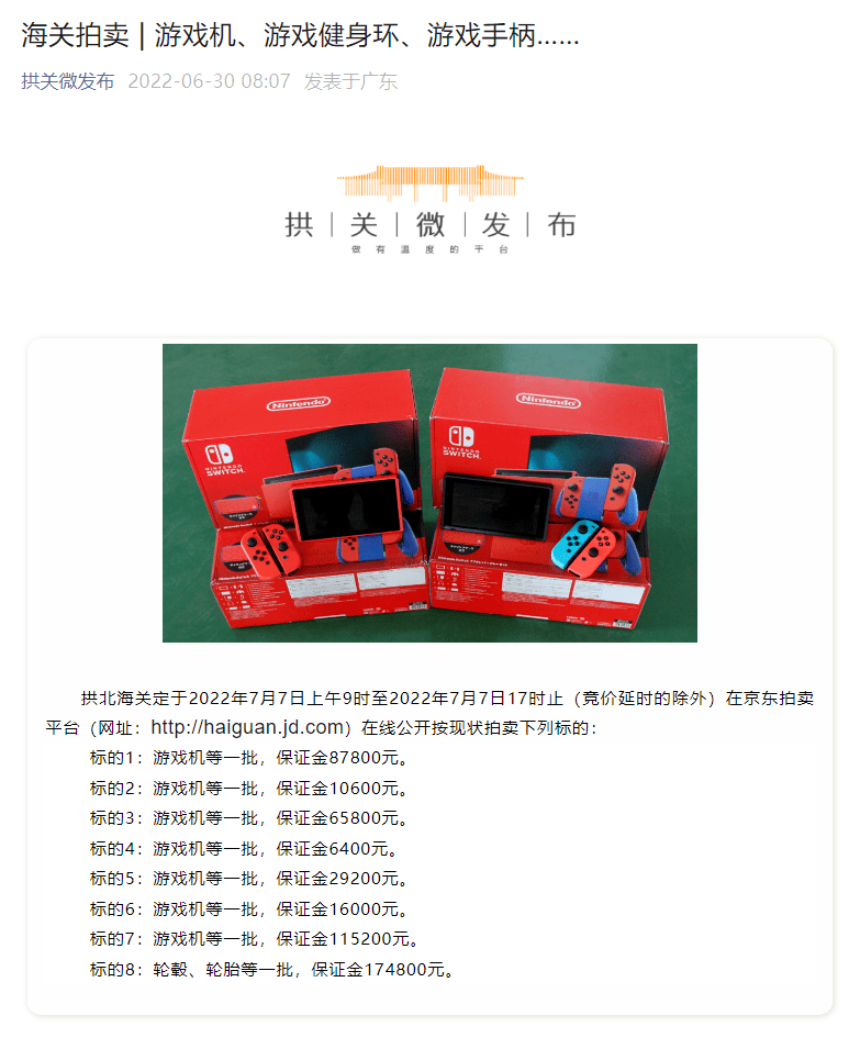 6月30日新闻,据“arch gate micro-release”新闻机构报道,北极海关计划于2022年7月7日上午9时至17时在北京拍卖平台拍卖大量在线商品,包括Switch、Switch Lite、PS5游戏机和游戏“Fitness Circle Adventure”。根据拍卖页计算当前价格,相关电子产品总值达16.5亿元。