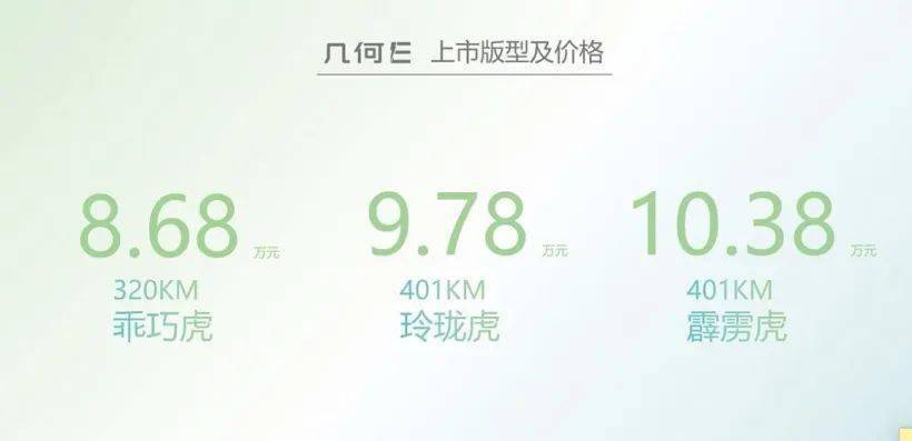 E几何是基于吉利4.超级智能工厂(张通工厂)生产和制造的,320公里和401公里版本有三个型号,从8.68亿美元到10.38亿美元,与聪明老虎的320公里的延续相符,tiger的201公里,tiger的201公里。(新闻来源: IT之家 )