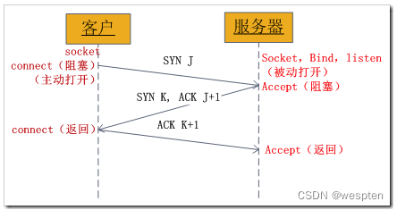 从图中可以看出,当客户调用连接时,触发了连接请求,向服务器发送SYN J包,这是当连接进入阻塞状态时;服务器听取连接请求时,收到SYNJ包,调用接受函数接收发送SYNK到客户端的请求,ACK J+1,客户端接收服务器的SYN K。在ACKJ+1之后,然后连接返回,并确认SYN K;当服务器接收ACK K+1时,accept返回,至此三次握手完毕,连接建立。
