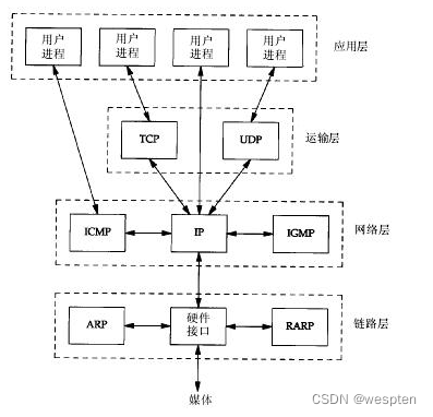 TCP/IP协议家族由传输层、网络层和链路层组成,接口是应用程序层和TCP/IP协议家族通信的中间软件抽象层。