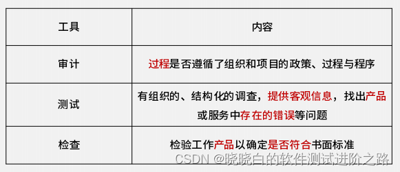 | 4 | 审计与测试 | (1)审计:关注过程 (2)测试/产品评价:关切的结果 测试:测试是一种比测试更大的测试 |