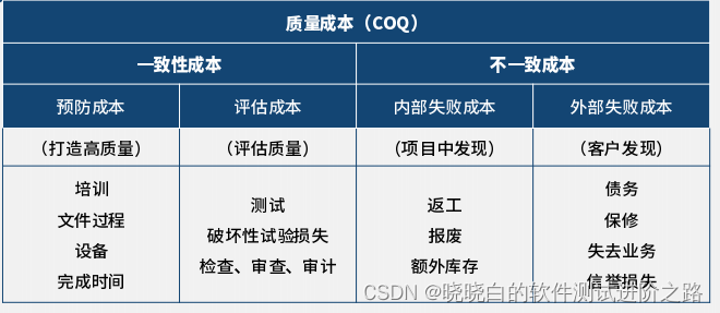 | 2 | 质量成本(COQ) | 一致性成本:预先花的钱是一致性成本,即预防成本和评价成本 不一致的成本:失败的成本 内部失败成本:在项目中发现 2外部故障成本:客户发现 |