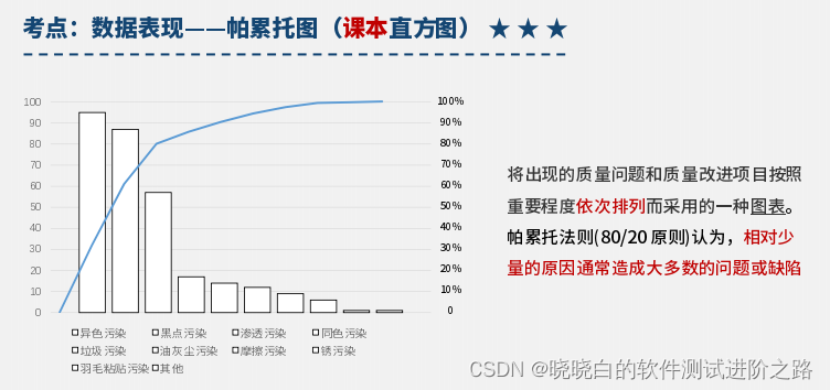 | 6 | 弹道图(课纸图) | 统计序列以捕捉主要矛盾 | 根据80/20原则,相对较小数量的原因是大多数问题的主要原因 |