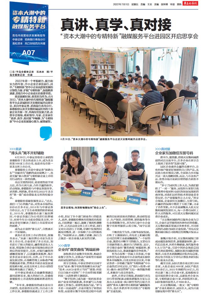 困难时期越重, 责任就越大.6月30日,中国泰证券、中国投资银行青岛分行、泰德股份及天津数码城公园的十多家企业齐聚,共同开展发展工作,天津数码城长阳区的“特别新”调解服务平台进入天津数码城。在现场,政府领导人、专家和企业家们谈论了“真正的谈话、真正的学习、真正的互动”并致力于发展“特别新”的中小企业。