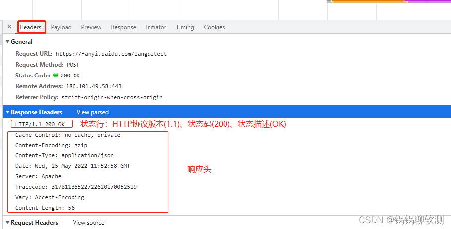 - 状态行:包含HTTP协议版本、状态代码和状态描述,由空间分隔