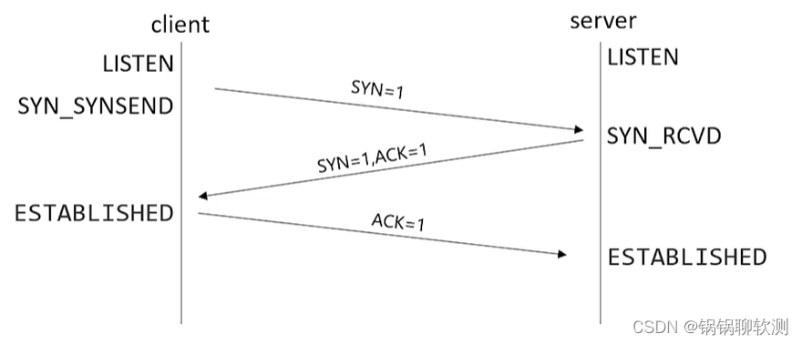 - 客户端告诉服务器我要访问你,完成第一个握手;客户将发送一个TCPSYN,和标记为1的包;同时指出客户端与服务器连接的端口;并发送后,客户端输入SYN_SYNSEND状态;并完成第一个握手