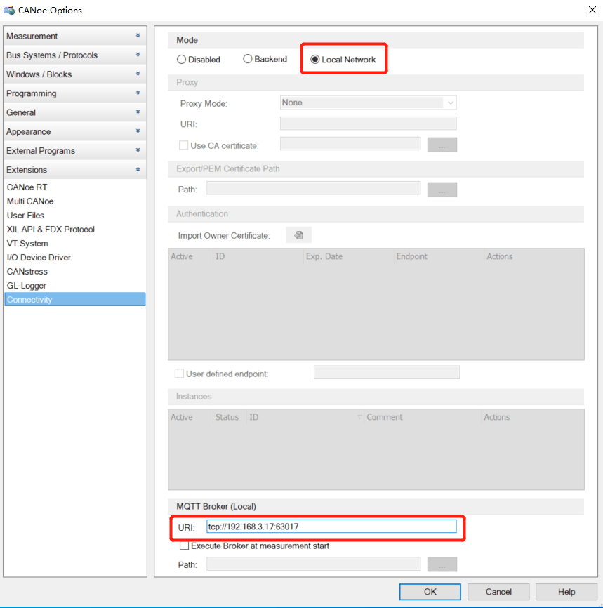 经纪人设置后,在CANoe选项设置窗口中配置经纪人的IP地址和端口(MQTT函数仅在连接到CANoe许可证时可用),如图2所示: