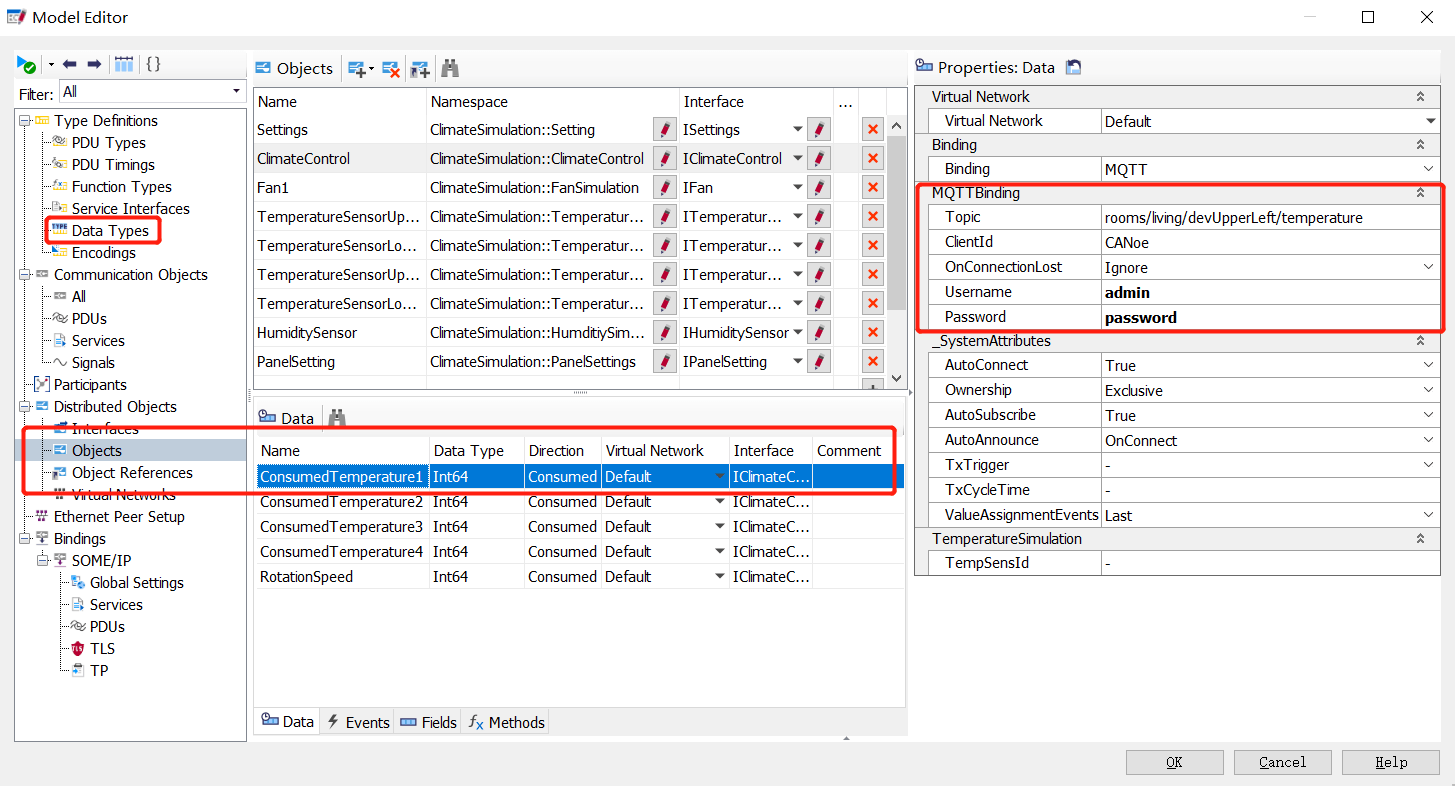 在模拟MQTT客户端之前,在CANoe的通信设置环境中,您需要手动创建分配对象的接口和对象,或通过vCDL文件,为MQTT创建数据库。