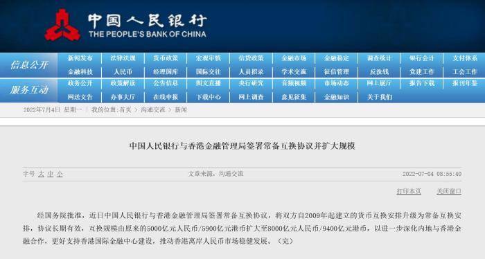 据中央银行7月4日网站报道,经国务院批准,最近,中国人民银行和香港金融管理局签署了备用交换协议,将双方自2009年建立的货币交换安排升级为永久性货币交换安排,协议长期有效,人民币兑换规模从原来的5亿人民币/59亿人民币扩大到8亿人民币/94亿人民币,为进一步深化内地与香港的财政合作,加强支持香港国际金融中心的建设,促进香港境外人民币市场的稳健发展。(中新财经)