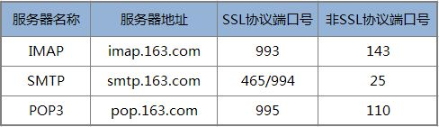 SMTP服务器地址: smtp.163.com(端口:25),使用SSL加密端口:994或465