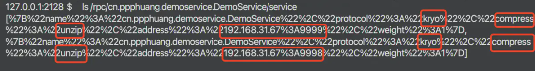 存储的节点信息包括服务名称、服务IP:PORT、序列化协议、压缩协议等。