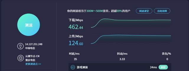 最后,了解该处理器的性能仍然是一个实测的问题,以我的家电500Mbps为例,实测下线速度462.44Mbps,线速度124.6Mbps,我家运行的500Mbps很好,期望数千MB的进程加快。