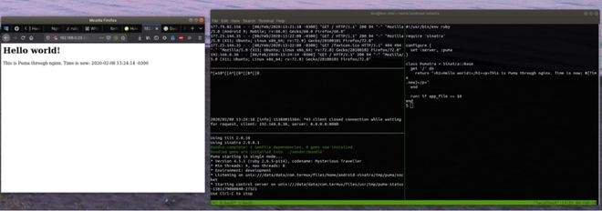 接下来我们需要一些技术,这样龙虾和熊猫可以一起工作。这个配置(https://gist.github.com/ctalkington/448153)很好,复制inx.conf,将 appdir 转换为您的网页应用程序的根目录。在我的配置中,我把它转换成/data/data/com/termux/files/home/android-sinatra。