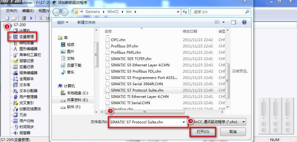 1、 打开 WINCC 软件,新建一个项目,右击【变量管理】,选择【添加新的驱动程序】选择【SIMATIC S7 Protocol Suite.chn】文件;