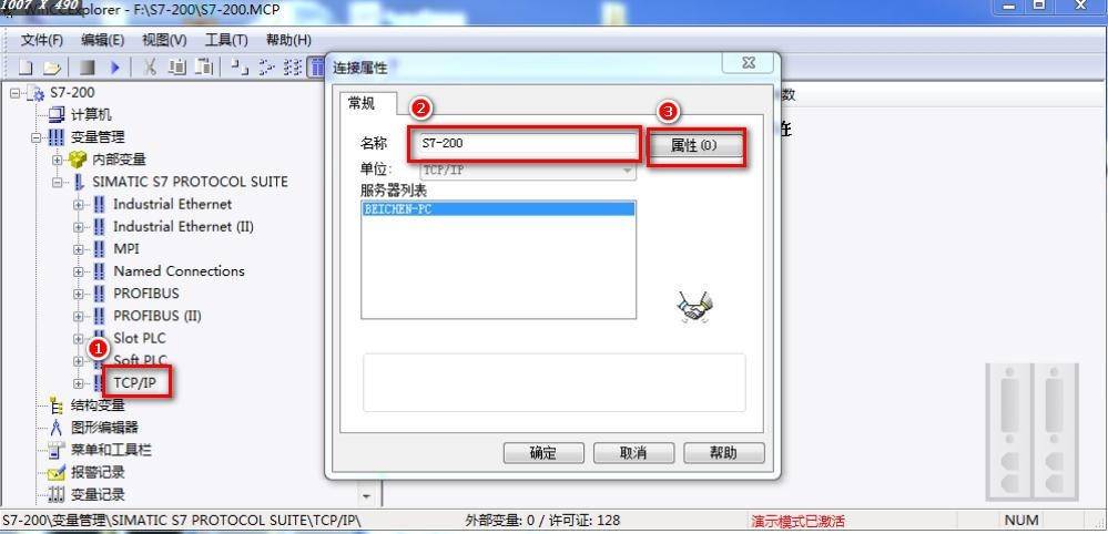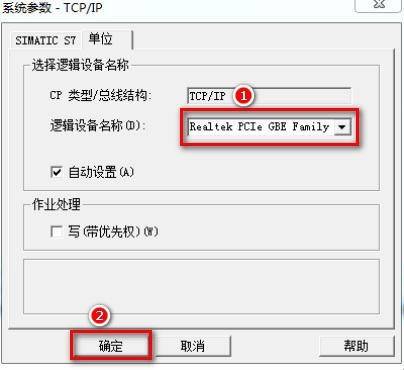3. 在 项目 栏 、 变量管理 下 右击 TCP / IP 连接,选择【系统参数】,在【单位】选项中的【逻辑设备名称(D)】中选择“TCP/IP->(计算机网卡)”。【逻辑设备名称(D)】中选择“TCP/IP->(计算机网卡)”。