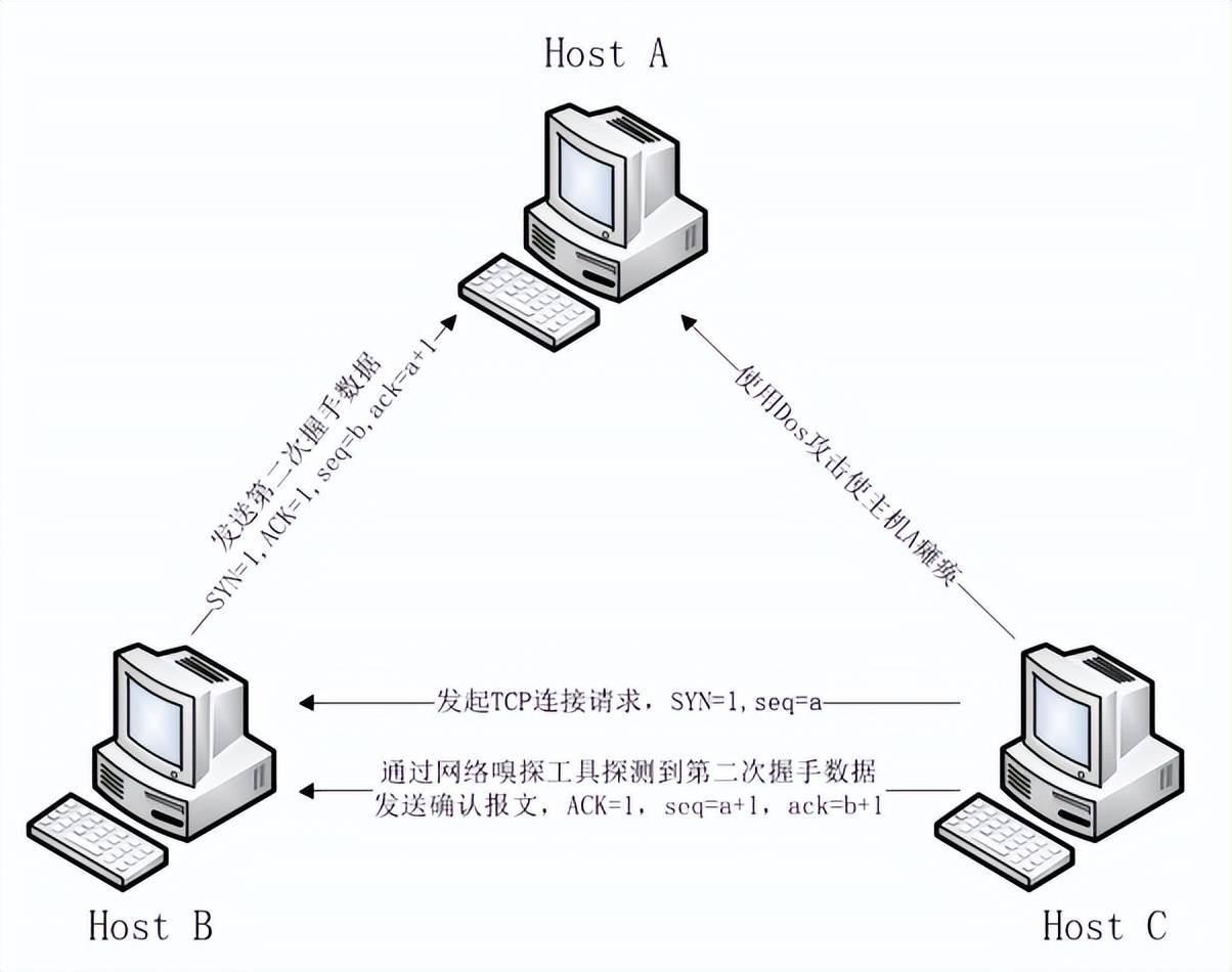 攻击者C首先向B发送连接请求消息,同步SYN设置为1,序列序列是a。B收到请求报文后,向A发出确认报文,确认号 ack是a+1,序列seq是b,因为A是瘫痪的,它不会发送响应消息。C通过网络嗅觉工具通过B向A发送的ack和seq,对B发送确认报文,将ACK 置为1,序列seq是a+1,确认号 ack为 b+1。因此,B与攻击者C之间的TCP连接直接建立,可以直接向B发送指令,而且B也相信命令是由合法的主人A发出的,将执行这些命令。这使得C可以任意向B发送攻击命令。致使B瘫痪。