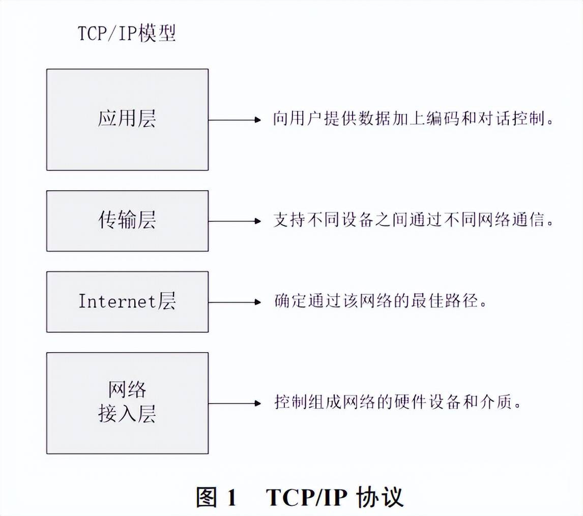 TCP/IP协议采用了4层的层级结构,分别是网络接入层、网络层、传输层和应用层。每一层都呼叫它的下一层所提供的网络来完成自己的需求。