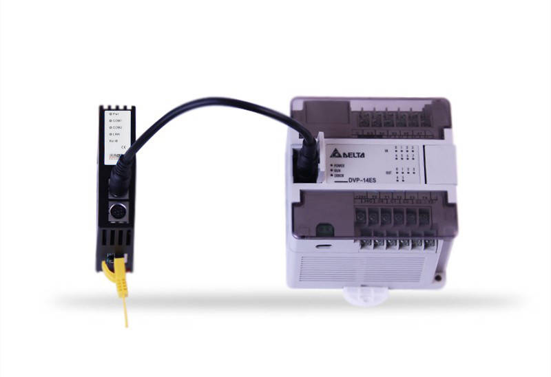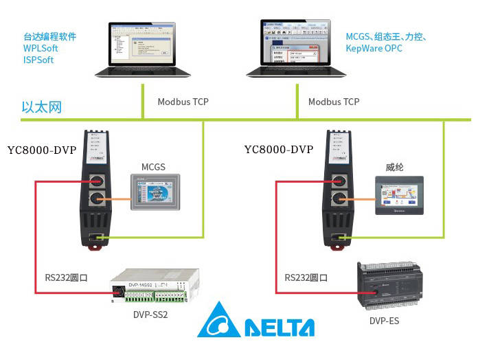 YC800-DVP采用外厂带通信线的模块化设计,不使用的PLC编程接口,即编程软件/超级计算机软件,通过Ethernet监控PLC数据,而触摸屏可以通过重新使用X2接口与PLC通信。