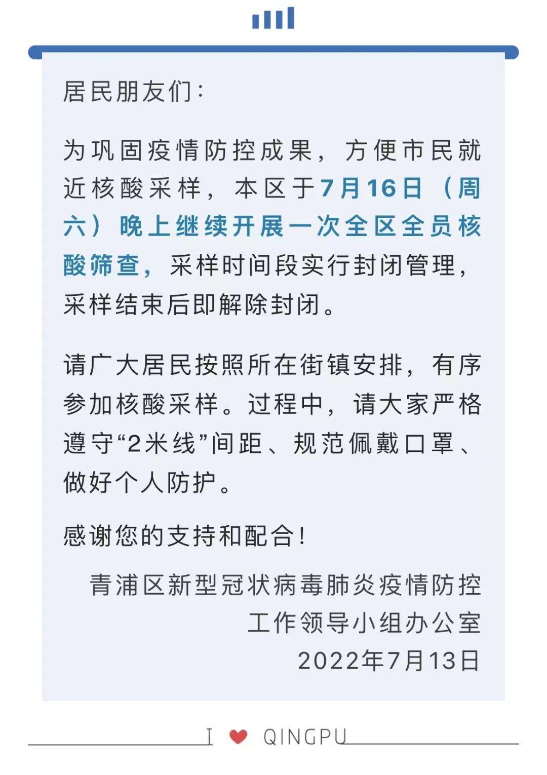 青浦:7月12日(星期二)晚上,进行了核酸的全面区域筛选。