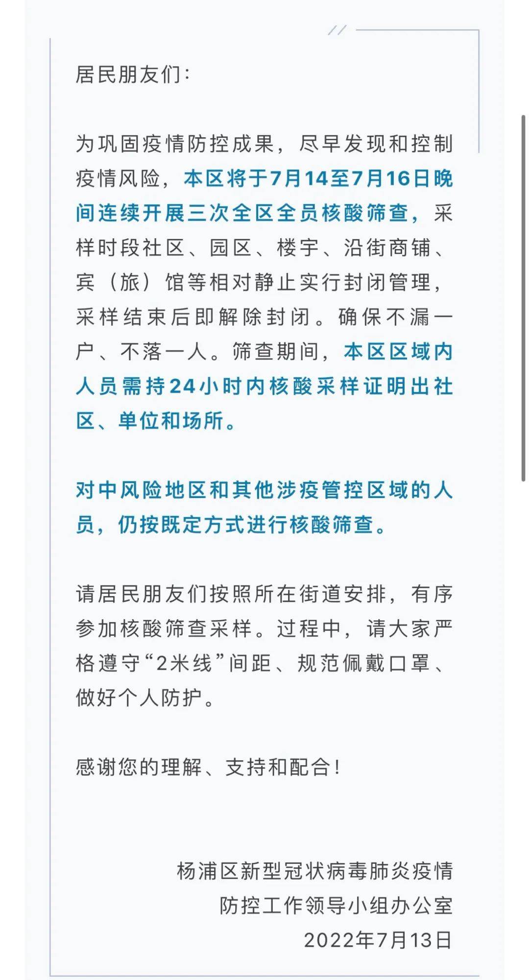 杨浦:7月12日(星期二)和7月13日(星期四)晚上进行了两次核酸的全面筛选。