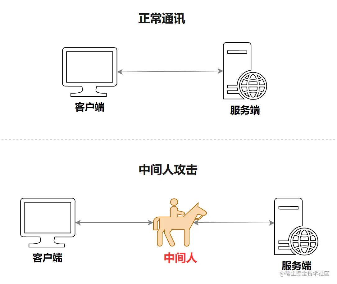 至于HTTS,首先解决的问题是信任问题,这就是身份验证的问题。除非解决了信任问题,否则将存在服务器伪造,这就是“中间攻击”的问题。所谓的中间人攻击意味着,通常情况下,客户会直接与服务端进行交互,但这里出现了一个“坏人”(中间人),它包含在客户端和服务器端之间,窃取和修改双方之间的通信内容,如下图所示: