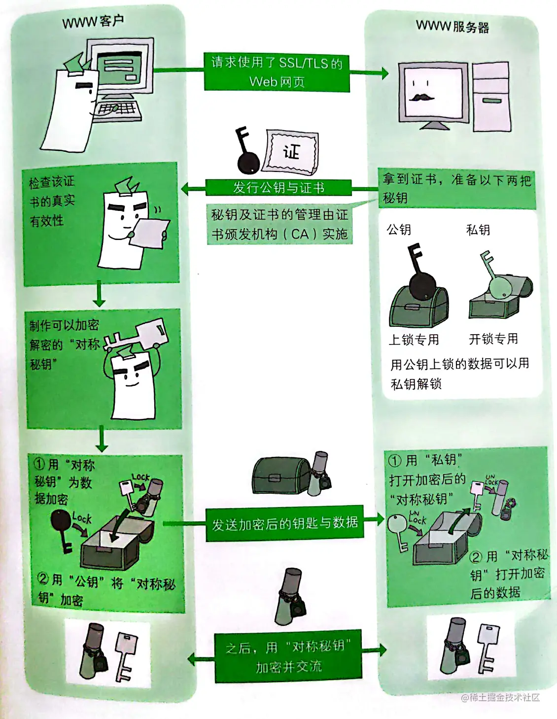 HTTPS中的对称加密还是非对称加密? 使用对称加密,速度快,但不安全;使用不对称加密安全,但速度慢。 只有小孩做选择,成年人都要,HTTPS使用非对称加密和对称加密,其整个交互过程如下: