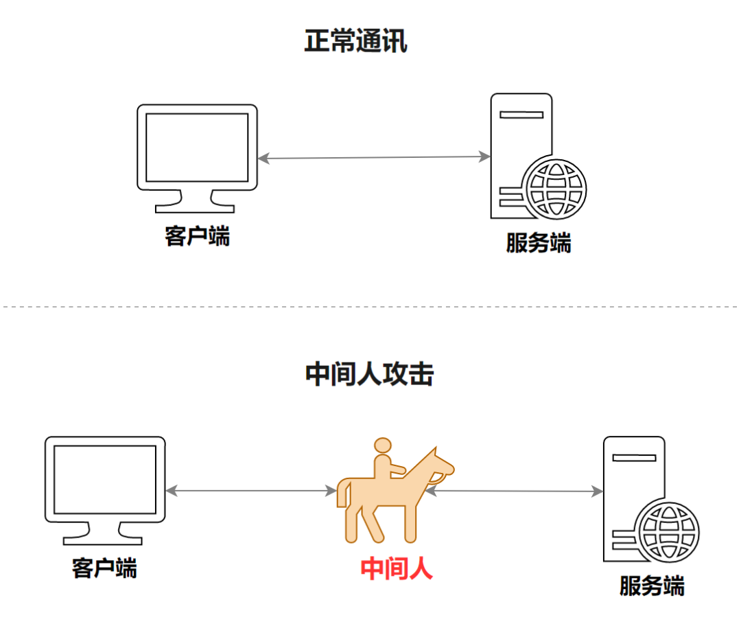 至于HTTS,首先解决的问题是信任问题,这就是身份验证的问题。除非解决了信任问题,否则将存在服务器伪造,这就是“中间攻击”的问题。所谓的中间人攻击意味着,通常情况下,客户会直接与服务端进行交互,但这里出现了一个“坏人”(中间人),它包含在客户端和服务器端之间,窃取和修改双方之间的通信内容,如下图所示:
