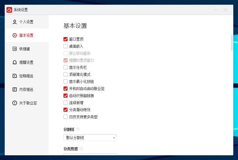 2、在基本设置中找到“窗口置顶”项,并勾选开启;