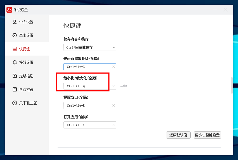 开启窗口置顶后,该备忘录的主要接口将永远显示在屏幕上,别担心被其他页面堵塞.同时,除开启窗口置顶外,Windows用户也可以使用默认快捷键Ctrl+Alt+Q,通过在屏幕上按键来最大化计算机的内存,再次按下该快捷键,也可以最小化一个键,并且在系统设置的快捷方式中可定制快捷方式设置。