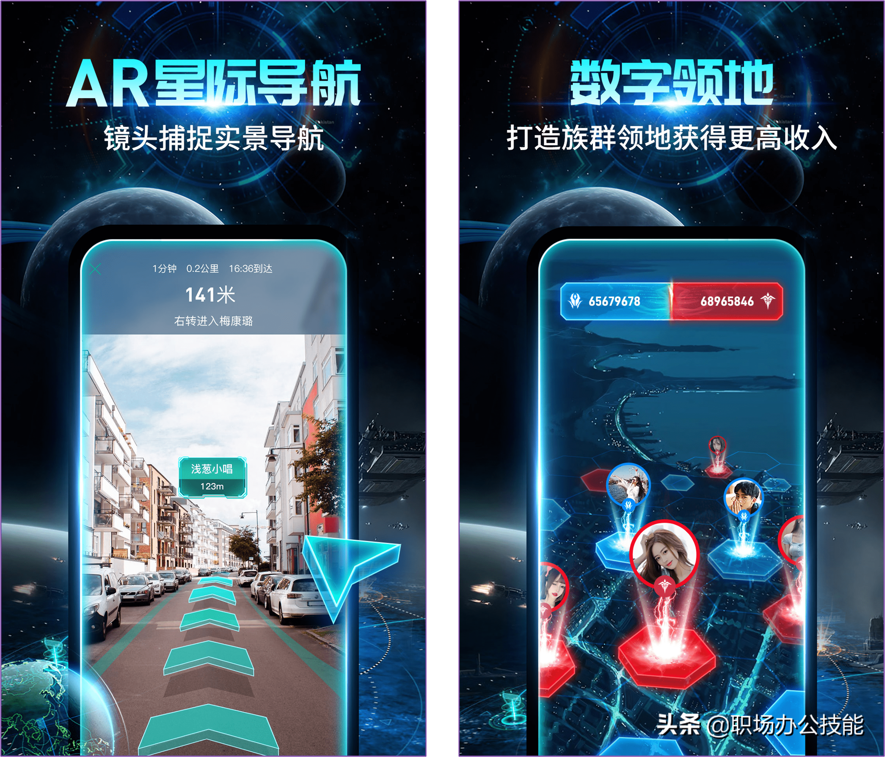 这个软件采用了全息AR技术,我们可以通过摄像头显示导航效果,帮助你更准确地找到正确的路线。还可以扫描周围的建筑,各种美食,电影,酒店,旅游景点等。这些位置已经给你明确标出来了。