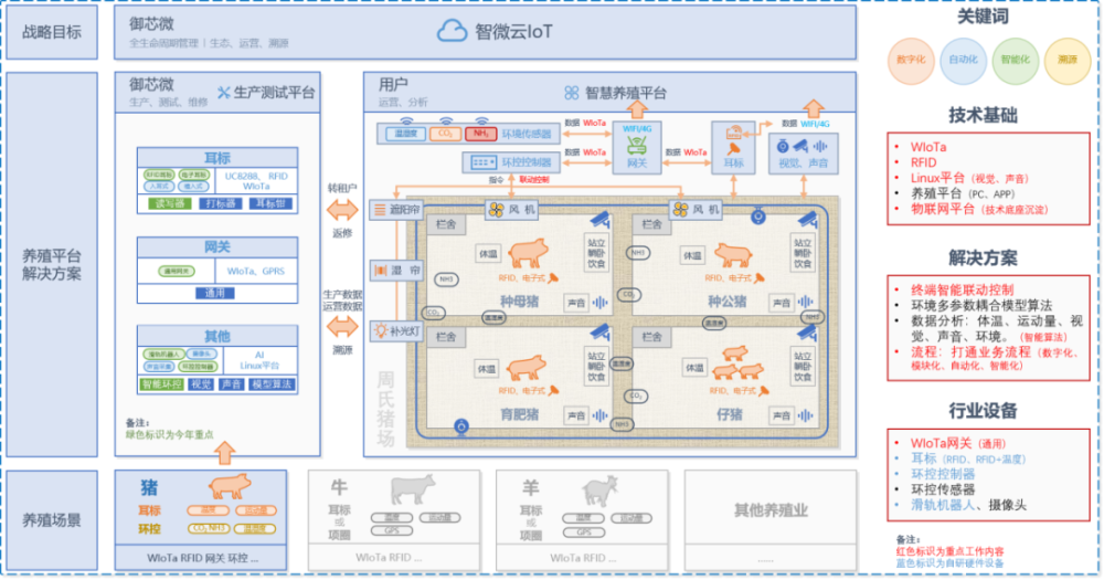 微智能畜牧综合方案包括耳标、网络开关、通信终端等传感器和硬件和智能养殖云平台。平台系统可以为每个猪创建一个身份文件.全天候自动收集活猪的核心体温、走路步骤、喂养行为、体重等,实时监测猪的健康状况,预防疾病,杜绝猪瘟,保证出栏率,通过可追踪系统实现不同的繁殖,提升生猪价值,建设区域品牌。一套系统,多个能力。实现政府管理数据化 、 耕作管理精细化 、 金融保险共同监管 、 智能畜牧业和农畜流通信息功能.