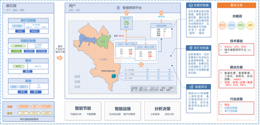 由御芯微自主研发,通过结合专有技术与照明行业关键需求,应用痛点研究与开发,为业界领先的街灯照明控制系统。该系统由统一的软件系统和各种终端组成,通过不同的产品组合实现各种照明控制功能,满足应用需求。端口包含一系列基于WIoT的智能硬件,包括宽带IoT通信协议芯片UC8288和其他自开发的MCU芯片。