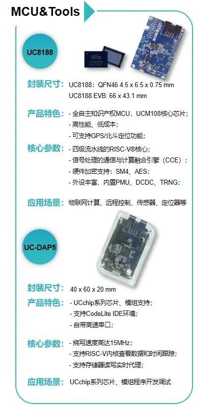 基于RISC-V开源架构,打造适用于物联网不同需求应用场景的多款MCU,配套SDK开发套件。御芯微首款MCU芯片UC8188,4级流水级,浮点运算器,ADC/DAC等多种外设,主频可达161MHz。