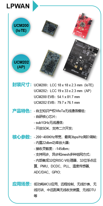 关键布局低功率宽带网络部署要求,御芯微自研广域物联网通信协议WIoTa和芯片UC8288,超低功耗,支持Sub1GHz带,200~400KHz带宽,定制完整的综合行业应用方案.它支持IOTE模块UCM200和AP模块UCM202。