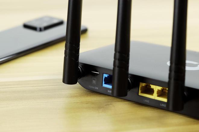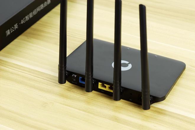 古奇X4C是办公室准备的产品,多景路由器也可以在家里使用,背面从左到右,依次是SIM卡槽、WAN口(蓝色)、两个LAN口(H色)、恢复处置孔、DC电源孔;WAN口、LAN口均为100Mbps自适应网口,加了颜色区分后,即使是不了解网络的小白人也可以快速配置。