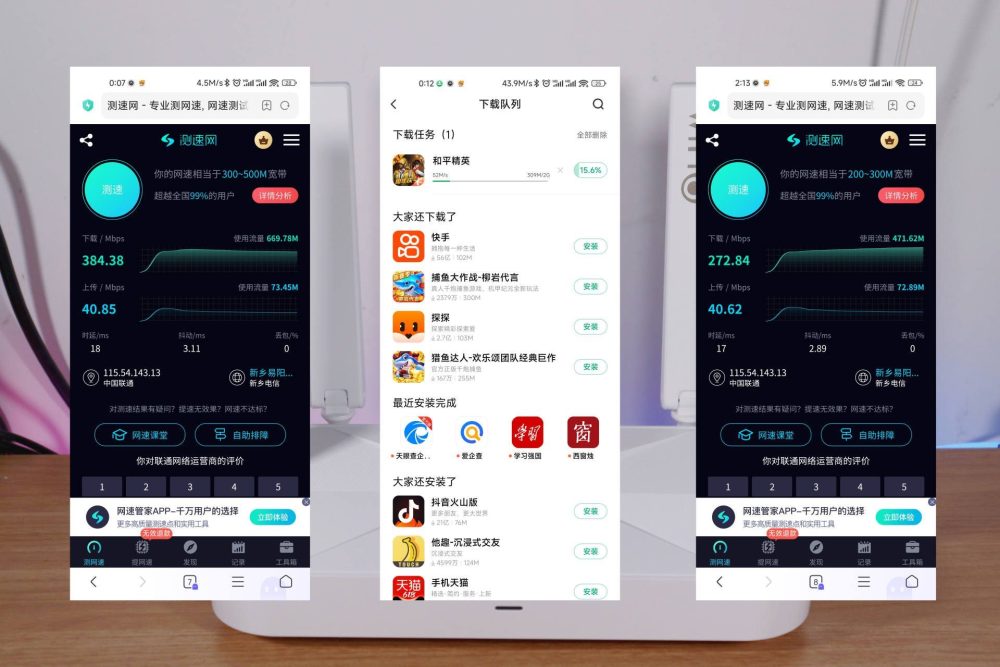 首先是测试网络的速度,我的家新安装的宽带是300M,而由运营商发送的路由器经常运行不愉快,当我被打断的时候,我更生气了。所以,在设置完成之后,首先是测试网络的速度,两侧是370-380Mbps,下载速度达到 40-50M/s,下载游戏非常快.
