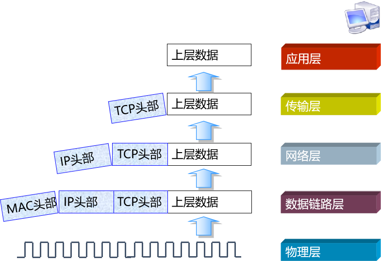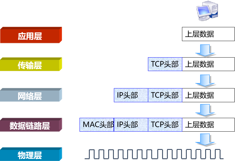从上到下处理数据的过程;在处理过程中数据包将变得越来越大;