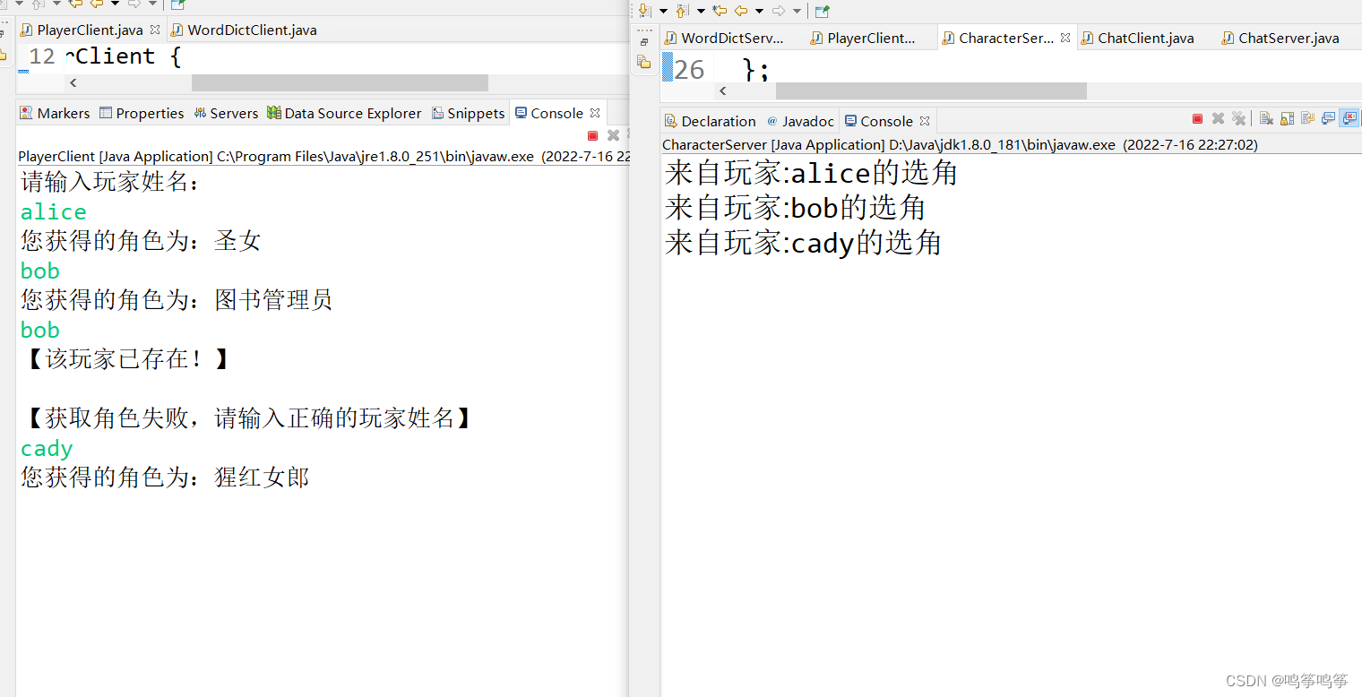 先创建一个List集合,用来存放人物角色,再创建一个Map集合,用来存放玩家与对应的人物角色<玩家,人物角色>。