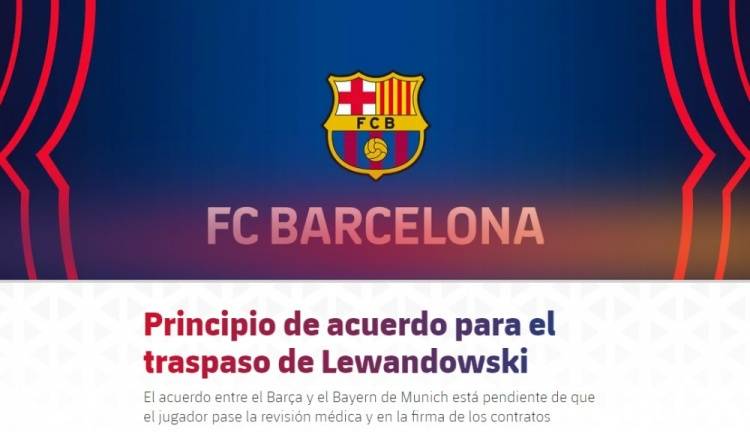 北京时间7月17日消息,西甲豪门巴塞罗那足球俱乐部官方表示,已就前锋莱万多夫斯基转会事宜与拜仁慕尼黑足球俱乐部达成了原则性协议,球员将在体检通过后正式加盟。