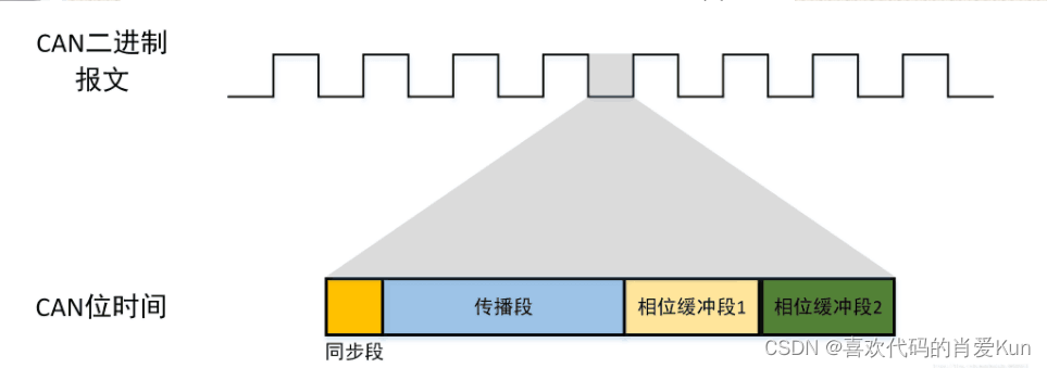 CAN传输1位由4个阶段组成:同步阶段、传输阶段、相缓冲阶段1、相缓冲阶段2;
