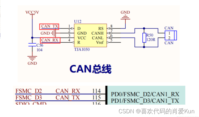 CAN的简要接口最终连接到CPU的PD0和PD1,并具有CAN的可重用功能。